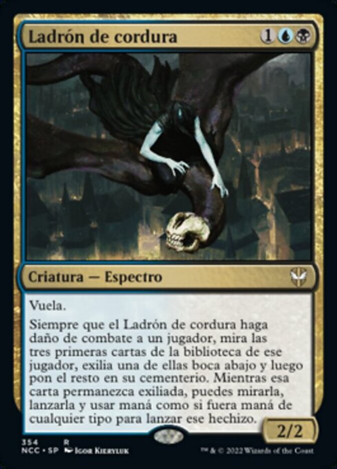 | Rules | Flying Whenever Thief of Sanity deals combat damage to a player, look at the top three cards of that player's library, exile one of them face down, then put the rest into their graveyard. You may look at and cast that card for as long as it remains exiled, and you may spend mana as though it were mana of any type to cast that spell. |
