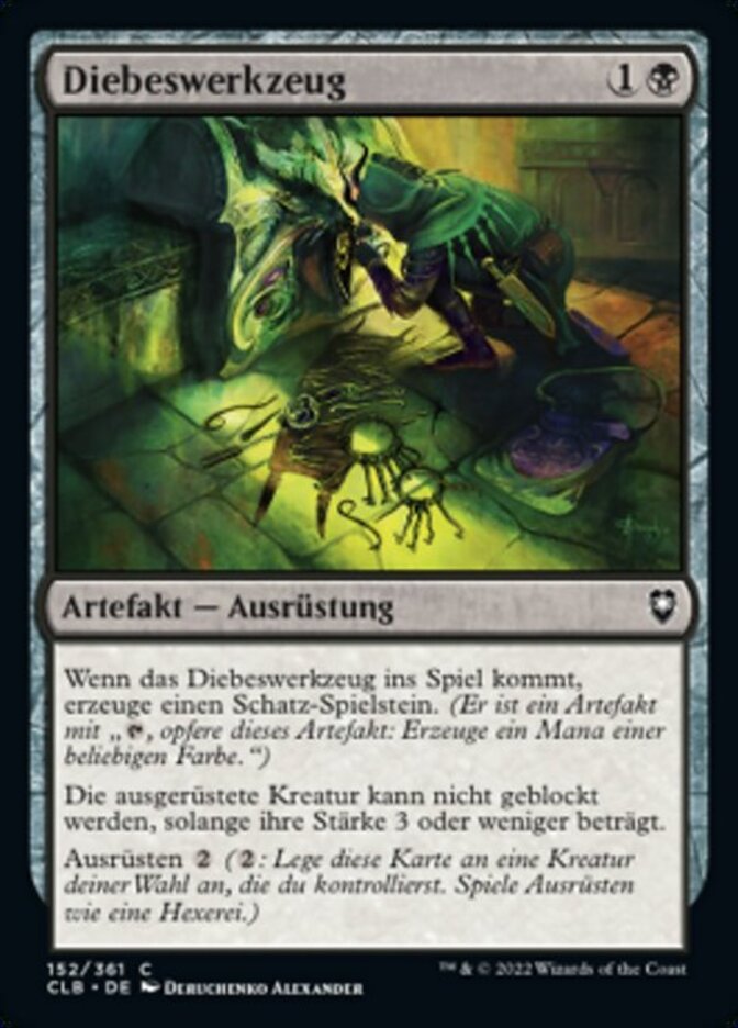 | Rules | When Thieves' Tools enters the battlefield, create a Treasure token. (It's an artifact with ", Sacrifice this artifact: Add one mana of any color.") Equipped creature can't be blocked as long as its power is 3 or less. Equip (: Attach to target creature you control. Equip only as a sorcery.) |