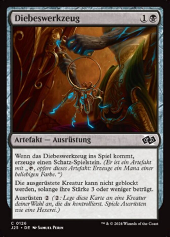 | Rules | When Thieves' Tools enters the battlefield, create a Treasure token. (It's an artifact with ", Sacrifice this artifact: Add one mana of any color.") Equipped creature can't be blocked as long as its power is 3 or less. Equip (: Attach to target creature you control. Equip only as a sorcery.) |
