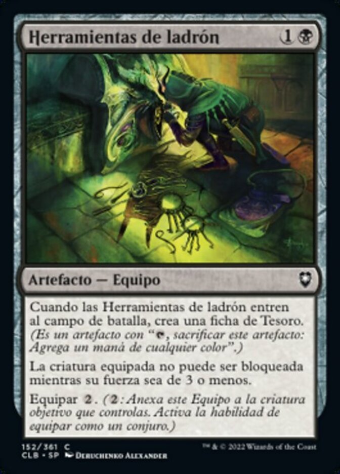 | Rules | When Thieves' Tools enters the battlefield, create a Treasure token. (It's an artifact with ", Sacrifice this artifact: Add one mana of any color.") Equipped creature can't be blocked as long as its power is 3 or less. Equip (: Attach to target creature you control. Equip only as a sorcery.) |