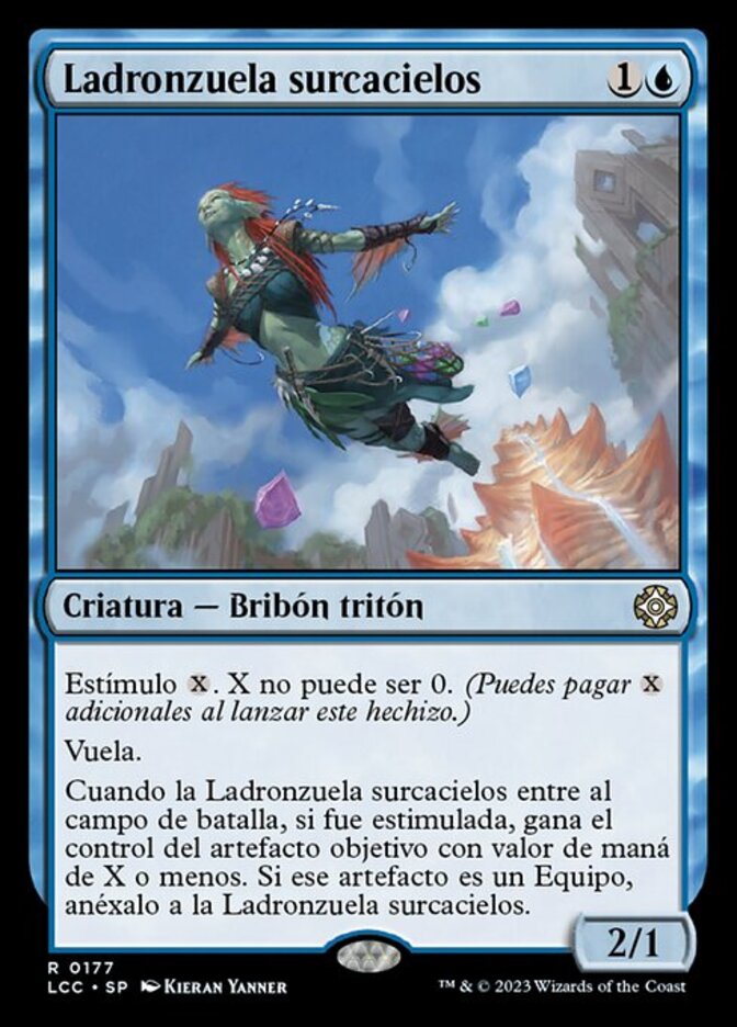 | Rules | Kicker . X can't be 0. (You may pay an additional as you cast this spell.) Flying When Thieving Skydiver enters the battlefield, if it was kicked, gain control of target artifact with mana value X or less. If that artifact is an Equipment, attach it to Thieving Skydiver. |