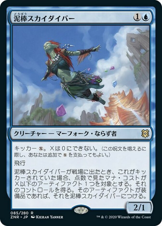 | Rules | Kicker . X can't be 0. (You may pay an additional as you cast this spell.) Flying When Thieving Skydiver enters the battlefield, if it was kicked, gain control of target artifact with mana value X or less. If that artifact is an Equipment, attach it to Thieving Skydiver. |