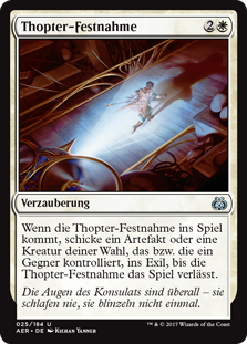 | Rules | When Thopter Arrest enters the battlefield, exile target artifact or creature an opponent controls until Thopter Arrest leaves the battlefield. |