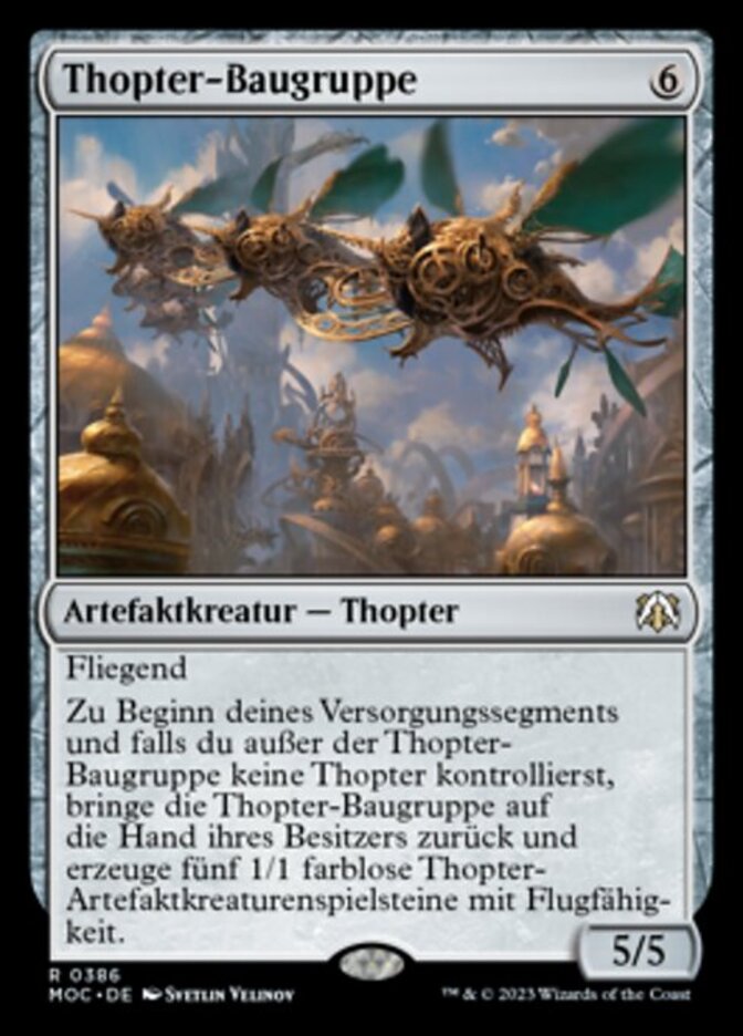 | Rules | Flying At the beginning of your upkeep, if you control no Thopters other than Thopter Assembly, return Thopter Assembly to its owner's hand and create five 1/1 colorless Thopter artifact creature tokens with flying. |