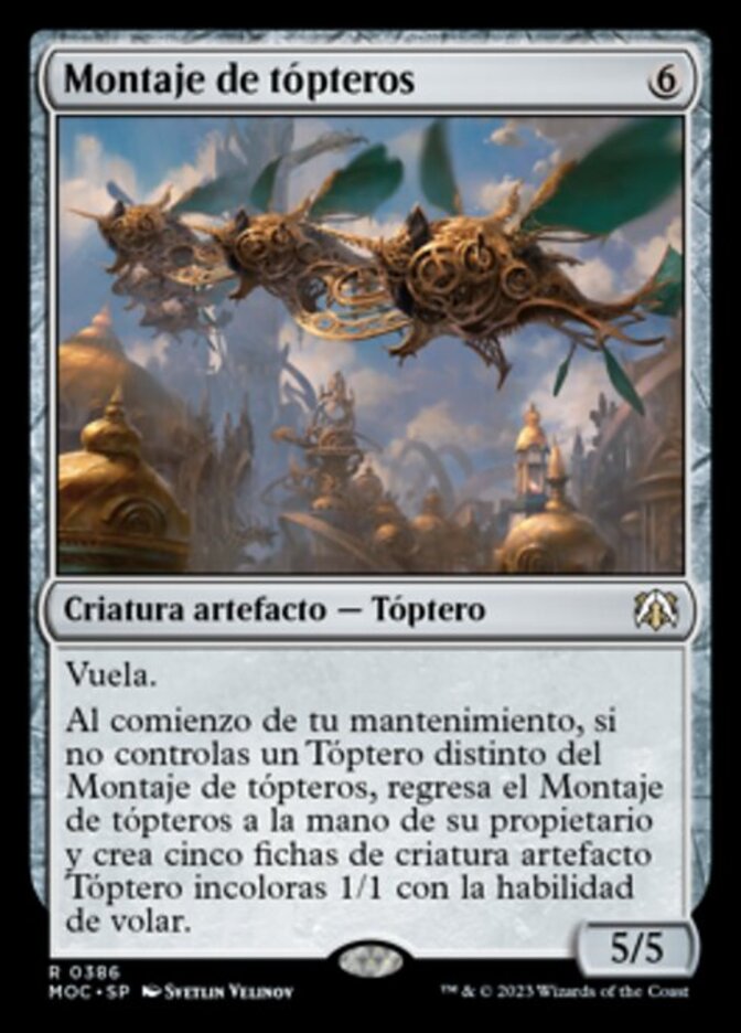 | Rules | Flying At the beginning of your upkeep, if you control no Thopters other than Thopter Assembly, return Thopter Assembly to its owner's hand and create five 1/1 colorless Thopter artifact creature tokens with flying. |