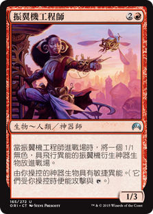 | Rules | When Thopter Engineer enters the battlefield, create a 1/1 colorless Thopter artifact creature token with flying. Artifact creatures you control have haste. (They can attack and as soon as they come under your control.) |