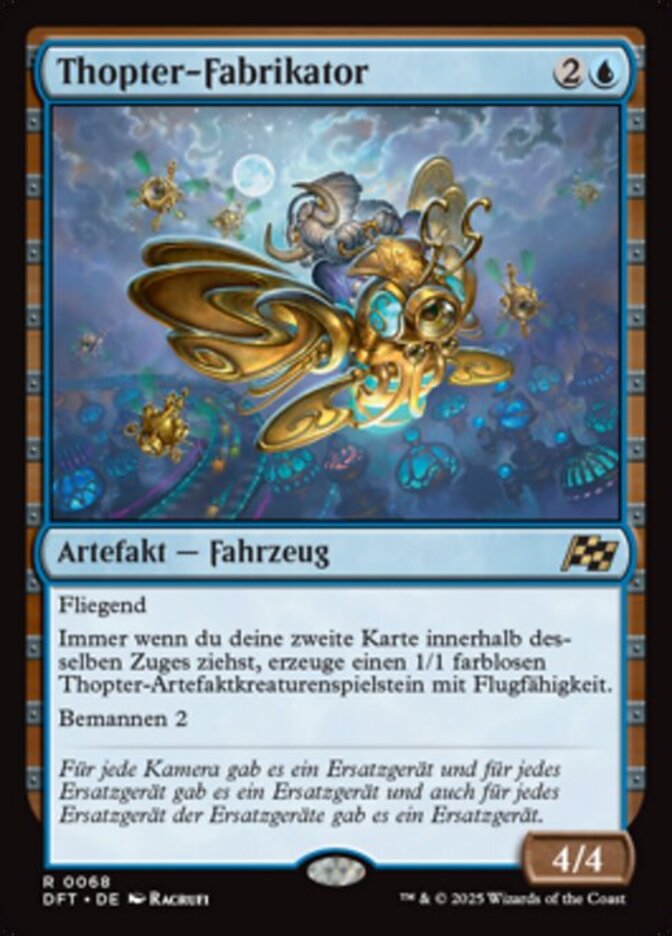 | Rules | Flying Whenever you draw your second card each turn, create a 1/1 colorless Thopter artifact creature token with flying. Crew 2 |