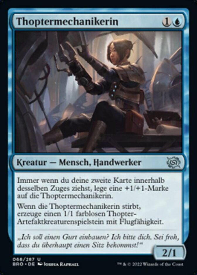 | Rules | Whenever you draw your second card each turn, put a +1/+1 counter on Thopter Mechanic. When Thopter Mechanic dies, create a 1/1 colorless Thopter artifact creature token with flying. |