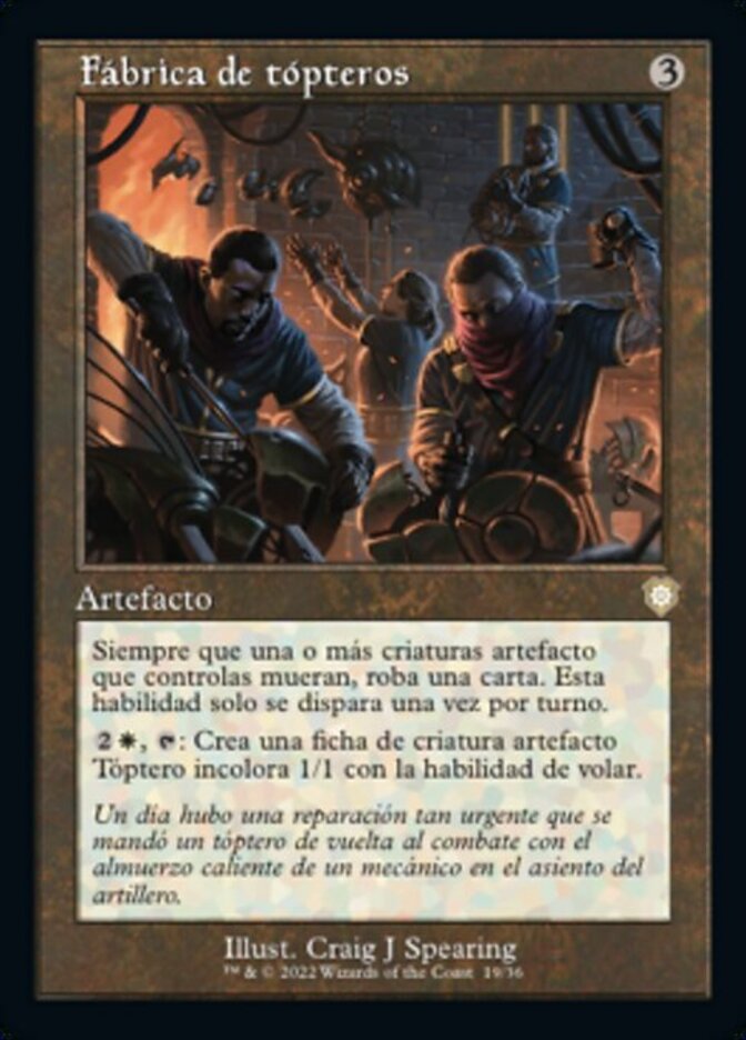| Rules | Whenever one or more artifact creatures you control die, draw a card. This ability triggers only once each turn. , : Create a 1/1 colorless Thopter artifact creature token with flying. |