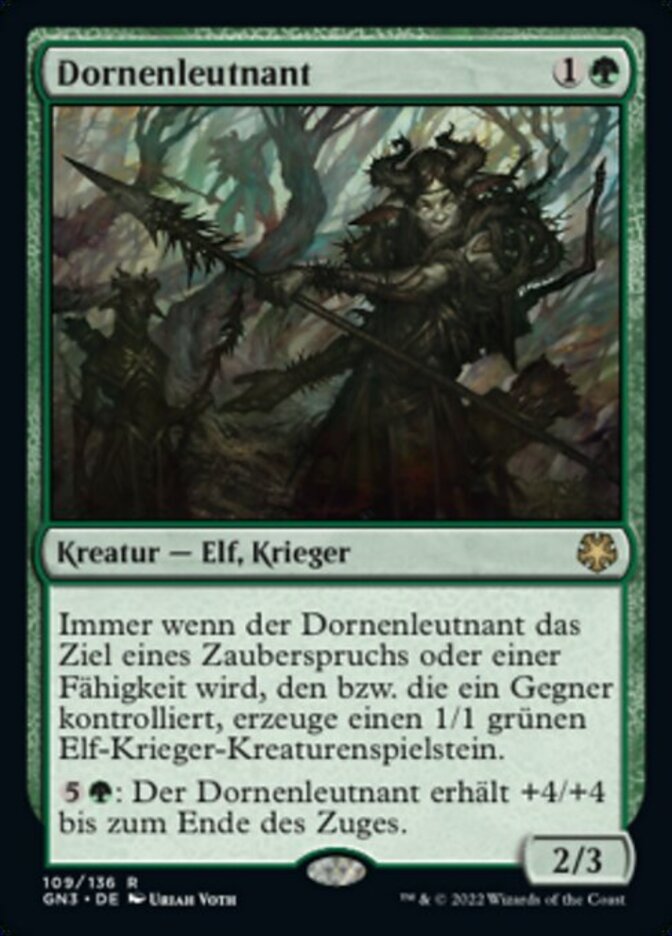 | Rules | Whenever Thorn Lieutenant becomes the target of a spell or ability an opponent controls, create a 1/1 green Elf Warrior creature token. : Thorn Lieutenant gets +4/+4 until end of turn. |