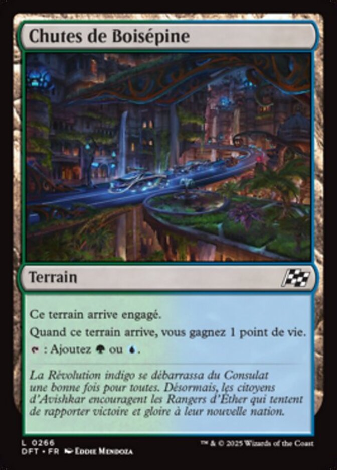 | Rules | Thornwood Falls enters the battlefield tapped. When Thornwood Falls enters the battlefield, you gain 1 life. : Add or . |