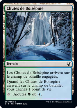 | Rules | Thornwood Falls enters the battlefield tapped. When Thornwood Falls enters the battlefield, you gain 1 life. : Add or . |