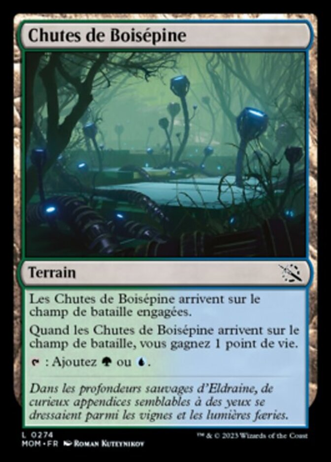 | Rules | Thornwood Falls enters the battlefield tapped. When Thornwood Falls enters the battlefield, you gain 1 life. : Add or . |