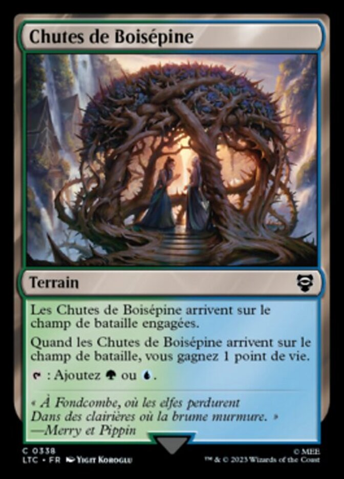 | Rules | Thornwood Falls enters the battlefield tapped. When Thornwood Falls enters the battlefield, you gain 1 life. : Add or . |