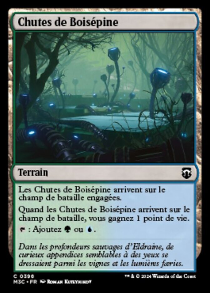 | Rules | Thornwood Falls enters the battlefield tapped. When Thornwood Falls enters the battlefield, you gain 1 life. : Add or . |