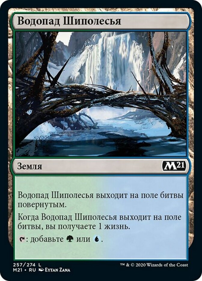 | Rules | Thornwood Falls enters the battlefield tapped. When Thornwood Falls enters the battlefield, you gain 1 life. : Add or . |