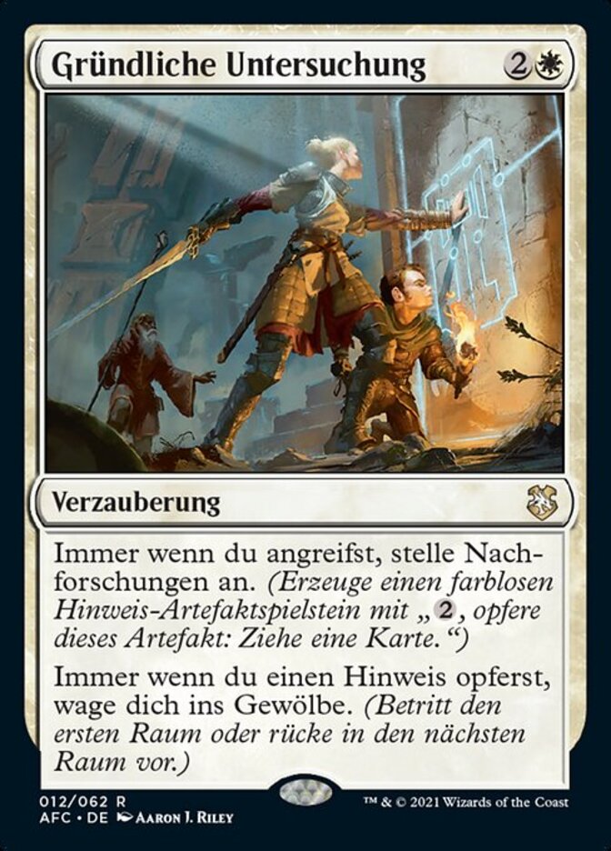 | Rules | Whenever you attack, investigate. (Create a colorless Clue artifact token with ", Sacrifice this artifact: Draw a card.") Whenever you sacrifice a Clue, venture into the dungeon. (Enter the first room or advance to the next room.) |