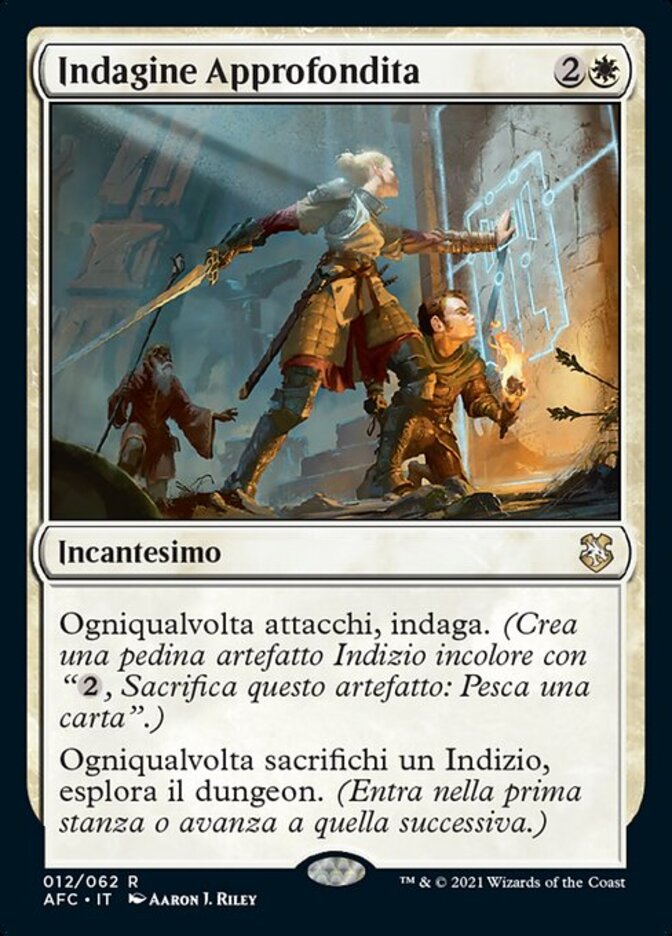 | Rules | Whenever you attack, investigate. (Create a colorless Clue artifact token with ", Sacrifice this artifact: Draw a card.") Whenever you sacrifice a Clue, venture into the dungeon. (Enter the first room or advance to the next room.) |