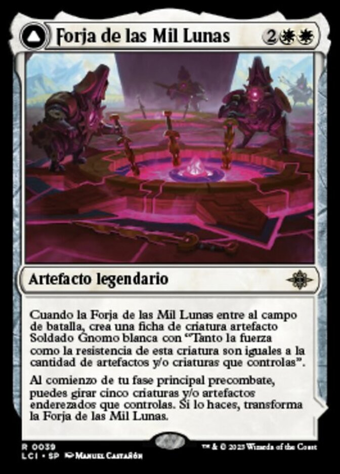 | Rules | When Thousand Moons Smithy enters the battlefield, create a white Gnome Soldier artifact creature token with "This creature's power and toughness are each equal to the number of artifacts and/or creatures you control." At the beginning of your precombat main phase, you may tap five untapped artifacts and/or creatures you control. If you do, transform Thousand Moons Smithy. // (Transforms from Thousand Moons Smithy.) : Add . Whenever you cast an artifact or creature spell using mana produced by Barracks of the Thousand, create a white Gnome Soldier artifact creature token with "This creature's power and toughness are each equal to the number of artifacts and/or creatures you control." |