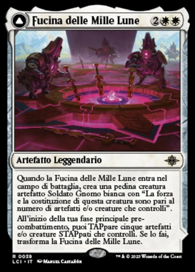| Rules | When Thousand Moons Smithy enters the battlefield, create a white Gnome Soldier artifact creature token with "This creature's power and toughness are each equal to the number of artifacts and/or creatures you control." At the beginning of your precombat main phase, you may tap five untapped artifacts and/or creatures you control. If you do, transform Thousand Moons Smithy. // (Transforms from Thousand Moons Smithy.) : Add . Whenever you cast an artifact or creature spell using mana produced by Barracks of the Thousand, create a white Gnome Soldier artifact creature token with "This creature's power and toughness are each equal to the number of artifacts and/or creatures you control." |