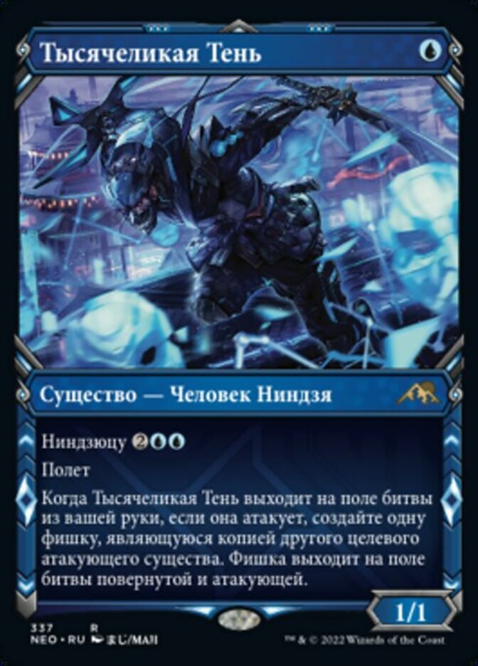 | Rules | Ninjutsu (, Return an unblocked attacker you control to hand: Put this card onto the battlefield from your hand tapped and attacking.) Flying When Thousand-Faced Shadow enters the battlefield from your hand, if it's attacking, create a token that's a copy of another target attacking creature. The token enters the battlefield tapped and attacking. |