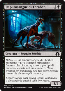 | Rules | Delirium — Thraben Foulbloods gets +1/+1 and has menace as long as there are four or more card types among cards in your graveyard. (A creature with menace can't be blocked except by two or more creatures.) |