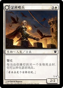 | Rules | Vigilance Whenever another creature you control dies, you may transform Thraben Sentry. // Trample |