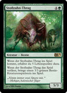 | Rules | When Thragtusk enters the battlefield, you gain 5 life. When Thragtusk leaves the battlefield, create a 3/3 green Beast creature token. |
