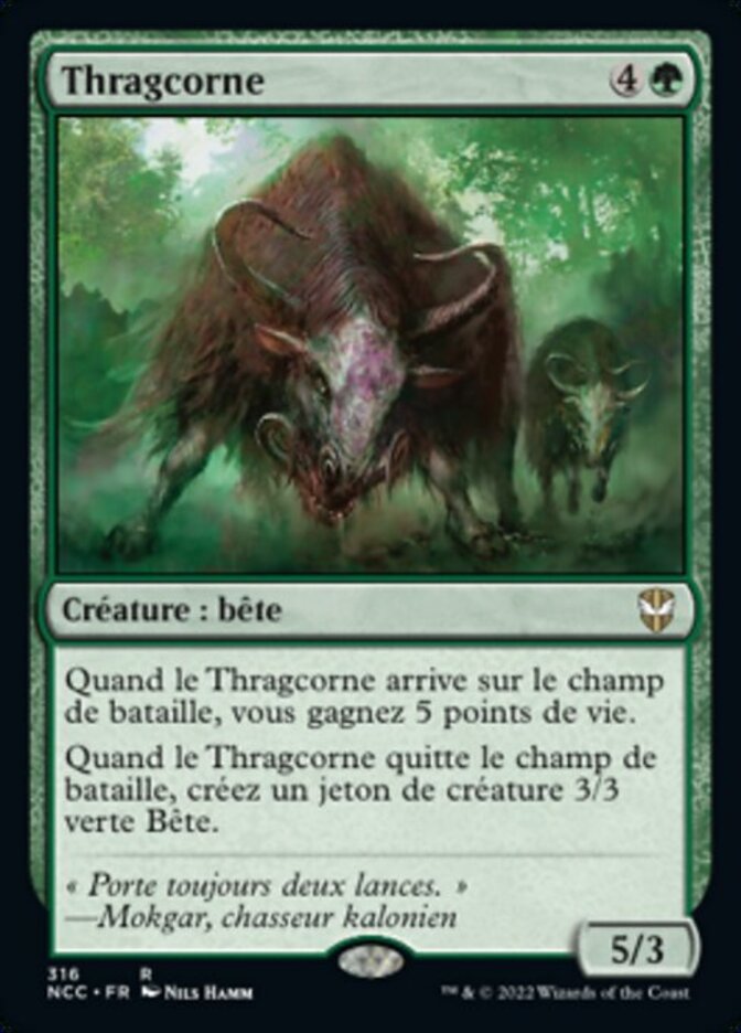 | Rules | When Thragtusk enters the battlefield, you gain 5 life. When Thragtusk leaves the battlefield, create a 3/3 green Beast creature token. |