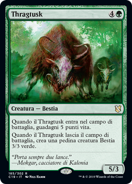 | Rules | When Thragtusk enters the battlefield, you gain 5 life. When Thragtusk leaves the battlefield, create a 3/3 green Beast creature token. |