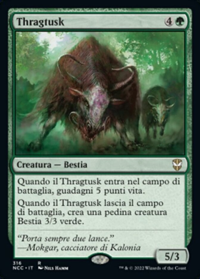 | Rules | When Thragtusk enters the battlefield, you gain 5 life. When Thragtusk leaves the battlefield, create a 3/3 green Beast creature token. |