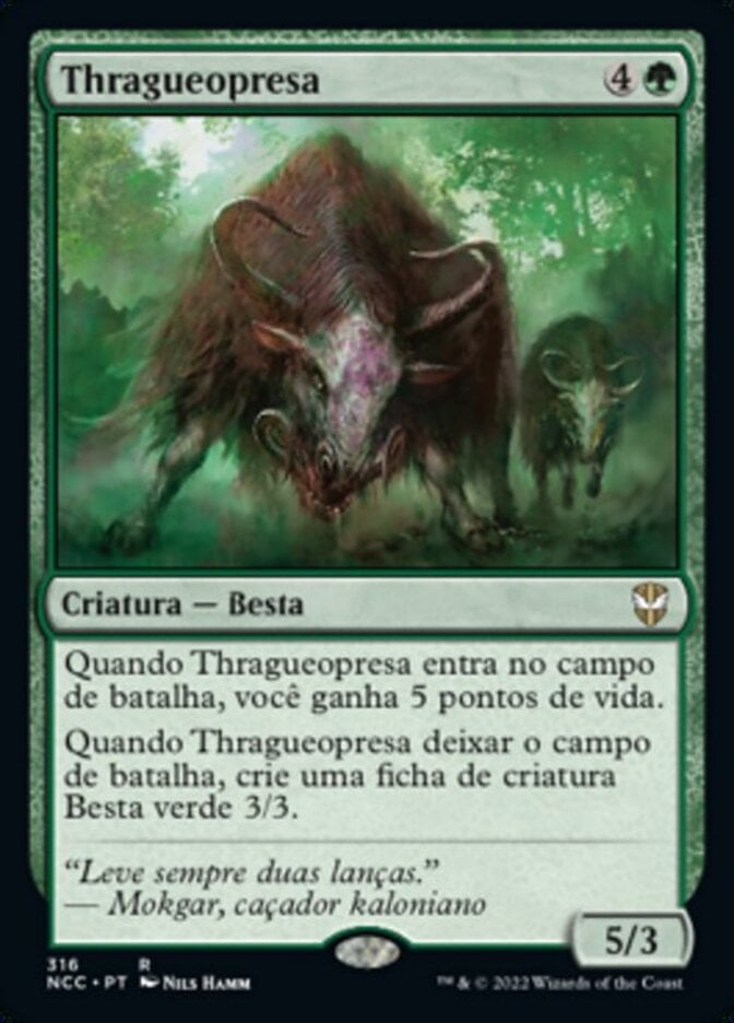 | Rules | When Thragtusk enters the battlefield, you gain 5 life. When Thragtusk leaves the battlefield, create a 3/3 green Beast creature token. |