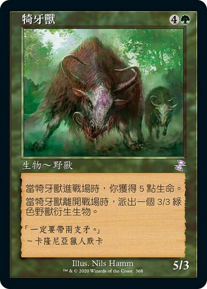 | Rules | When Thragtusk enters the battlefield, you gain 5 life. When Thragtusk leaves the battlefield, create a 3/3 green Beast creature token. |