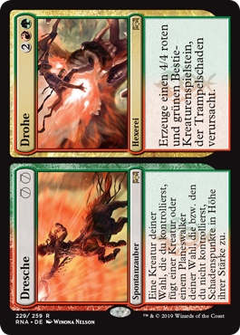 | Rules | Target creature you control deals damage equal to its power to target creature or planeswalker you don't control. // Create a 4/4 red and green Beast creature token with trample. |