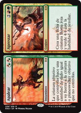 | Rules | Target creature you control deals damage equal to its power to target creature or planeswalker you don't control. // Create a 4/4 red and green Beast creature token with trample. |