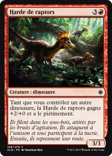 | Rules | As long as you control another Dinosaur, Thrash of Raptors gets +2/+0 and has trample. |
