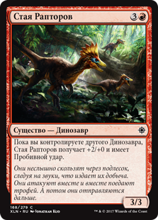 | Rules | As long as you control another Dinosaur, Thrash of Raptors gets +2/+0 and has trample. |