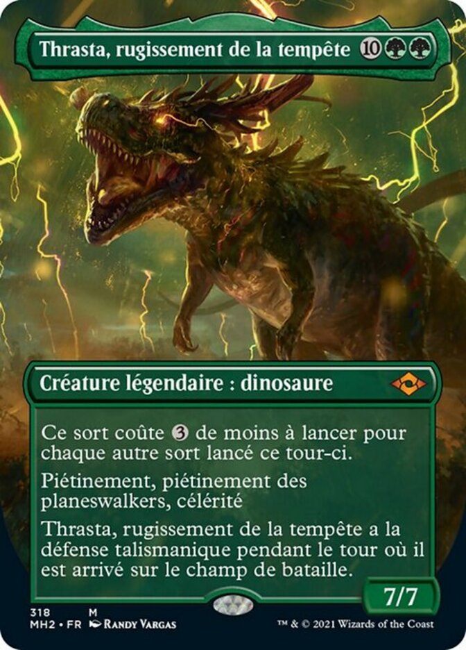 | Rules | This spell costs less to cast for each other spell cast this turn. Trample, haste Trample over planeswalkers (This creature can deal excess combat damage to the controller of the planeswalker it's attacking.) Thrasta, Tempest's Roar has hexproof as long as it entered the battlefield this turn. |
