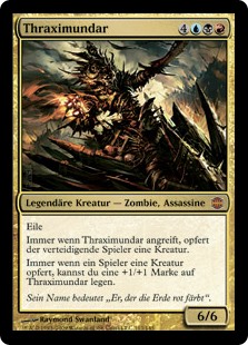 | Rules | Haste Whenever Thraximundar attacks, defending player sacrifices a creature. Whenever a player sacrifices a creature, you may put a +1/+1 counter on Thraximundar. |