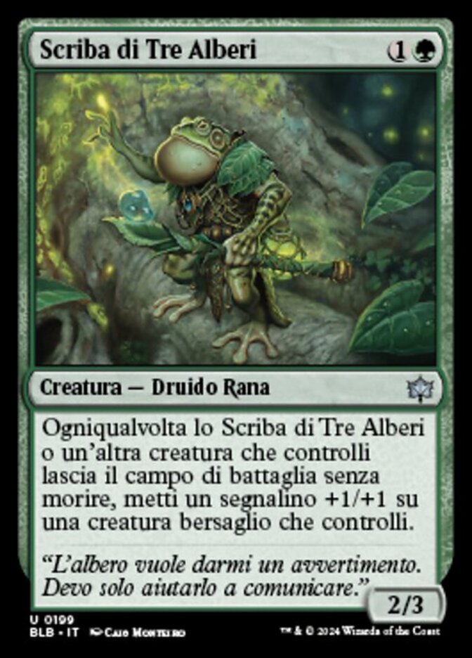 | Rules | Whenever Three Tree Scribe or another creature you control leaves the battlefield without dying, put a +1/+1 counter on target creature you control. |