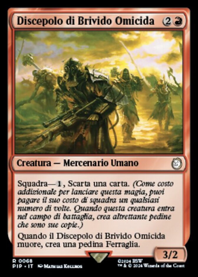 | Rules | Squad—, Discard a card. (As an additional cost to cast this spell, you may pay its squad cost any number of times. When this creature enters the battlefield, create that many tokens that are copies of it.) When Thrill-Kill Disciple dies, create a Junk token. |