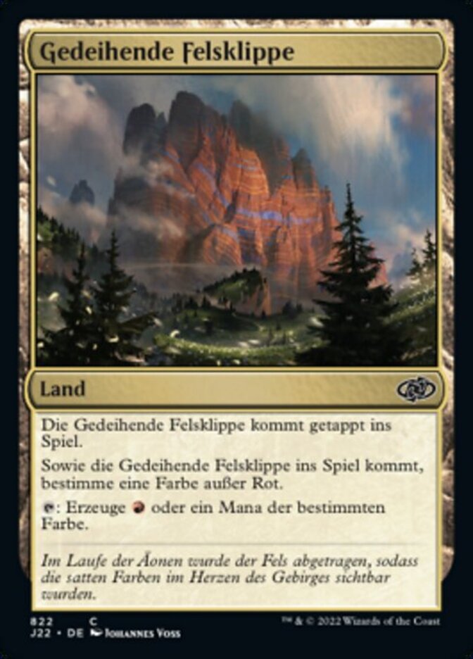 | Rules | Thriving Bluff enters the battlefield tapped. As Thriving Bluff enters the battlefield, choose a color other than red. : Add or one mana of the chosen color. |
