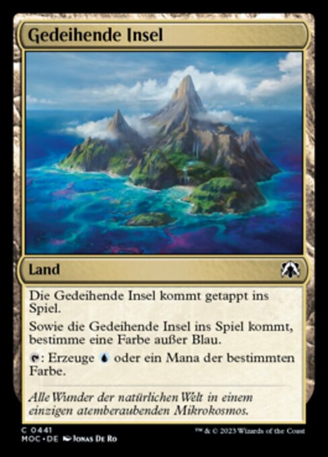 | Rules | Thriving Isle enters the battlefield tapped. As Thriving Isle enters the battlefield, choose a color other than blue. : Add or one mana of the chosen color. |
