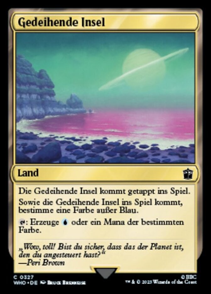 | Rules | Thriving Isle enters the battlefield tapped. As Thriving Isle enters the battlefield, choose a color other than blue. : Add or one mana of the chosen color. |