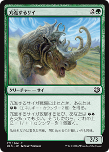 | Rules | When Thriving Rhino enters the battlefield, you get (two energy counters). Whenever Thriving Rhino attacks, you may pay . If you do, put a +1/+1 counter on it. |