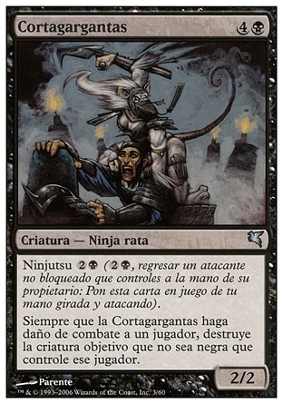 | Rules | Ninjutsu (, Return an unblocked attacker you control to hand: Put this card onto the battlefield from your hand tapped and attacking.) Whenever Throat Slitter deals combat damage to a player, destroy target nonblack creature that player controls. |