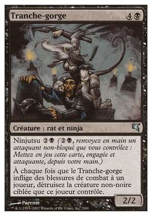 | Rules | Ninjutsu (, Return an unblocked attacker you control to hand: Put this card onto the battlefield from your hand tapped and attacking.) Whenever Throat Slitter deals combat damage to a player, destroy target nonblack creature that player controls. |