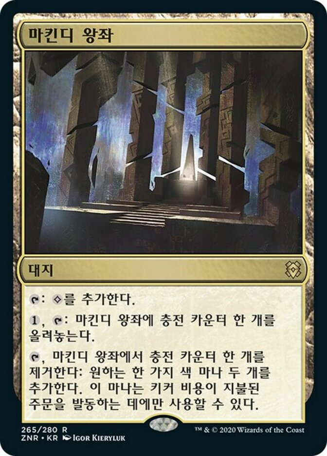| Rules | : Add . , : Put a charge counter on Throne of Makindi. , Remove a charge counter from Throne of Makindi: Add two mana of any one color. Spend this mana only to cast kicked spells. |