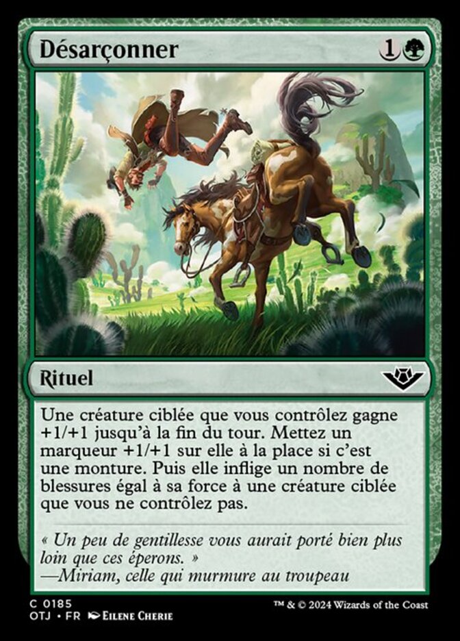 | Rules | Target creature you control gets +1/+1 until end of turn. Put a +1/+1 counter on it instead if it's a Mount. Then it deals damage equal to its power to target creature you don't control. |