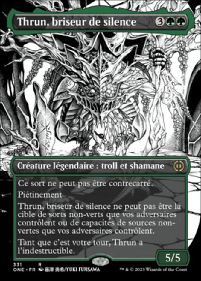 | Rules | This spell can't be countered. Trample Thrun, Breaker of Silence can't be the target of nongreen spells your opponents control or abilities from nongreen sources your opponents control. As long as it's your turn, Thrun has indestructible. |